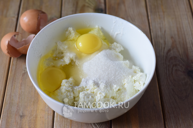 В другую миску выложить творог, вбить яйца, добавить крахмал и сахар.