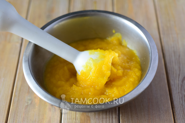 Мягкие кусочки тыквы выложить в миску и перебить блендером до состояния однородного пюре. Для дальнейшей работы потребуется охлажденное пюре, поэтому на время отставим миску с тыквенным пюре в сторону.