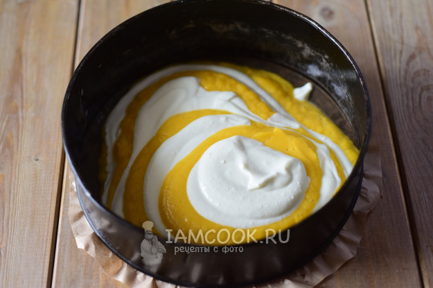 Приступить к сборке запеканки: сначала на середину формы выложить две столовые ложки творожного слоя, затем сверху выложить две столовые ложки тыквенного слоя, не тревожа первый слой. Так, чередуя тыквенный и творожный слои, выложить обе смеси до полного расхода.