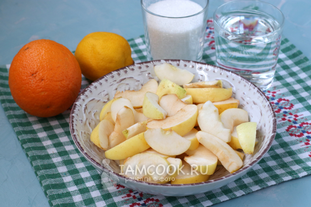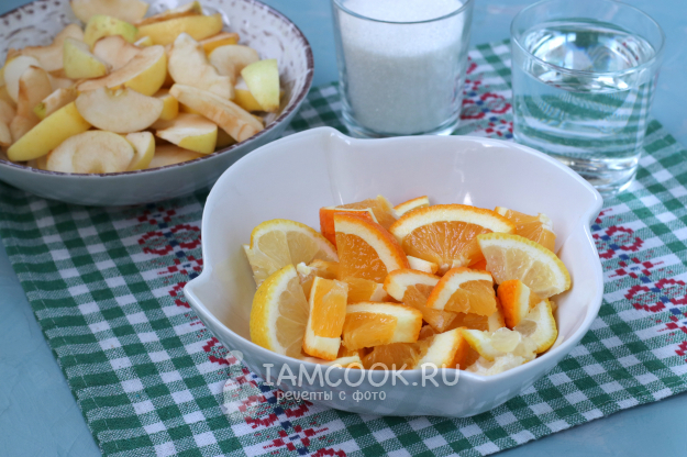Для приготовления компота из яблок, апельсина и лимона подготовить из списка необходимые ингредиенты.