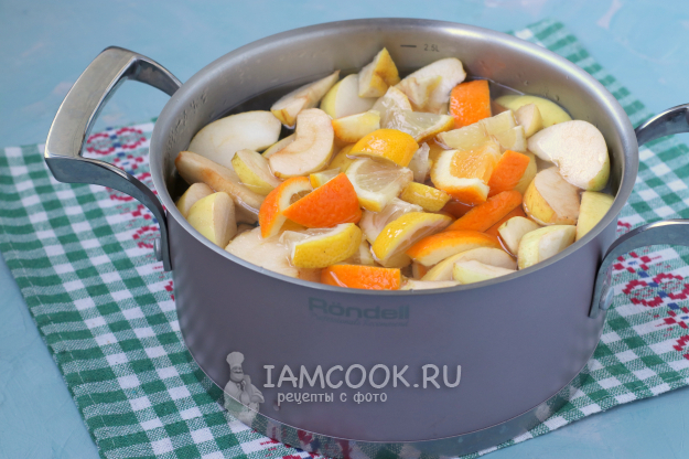 Затем лимоны и апельсины. Довести всё вместе до кипения.