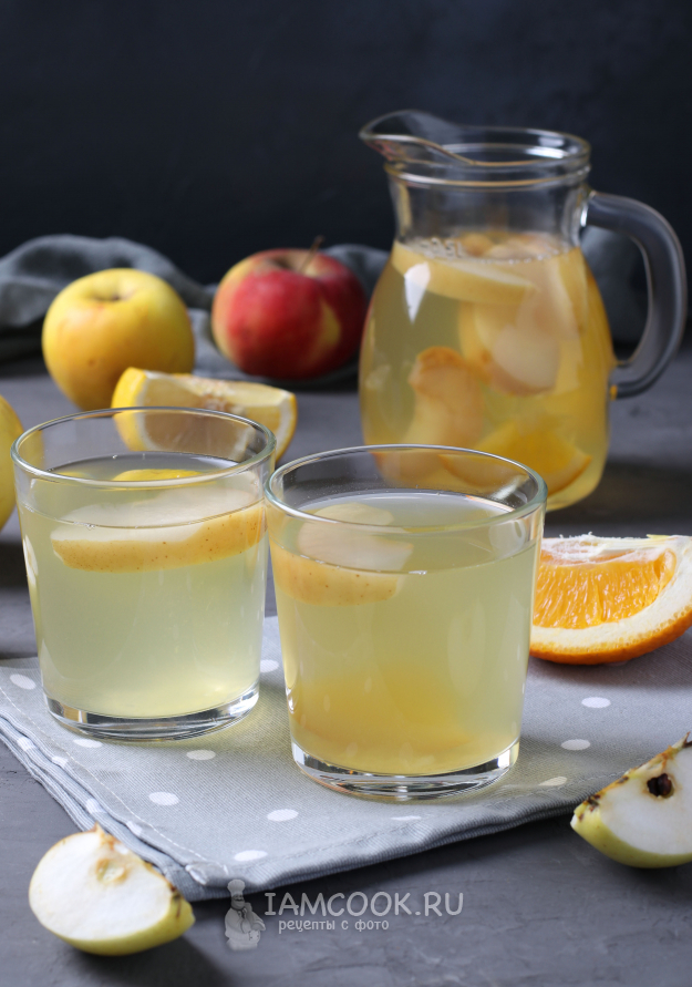 Компот из свежих зелёных яблок, мандарина и апельсина. Витаминизированный напиток. В Якутск переехали с Полюса холода, Верхоянска. Фрукты в Якутске недорогие. Как хорошо.