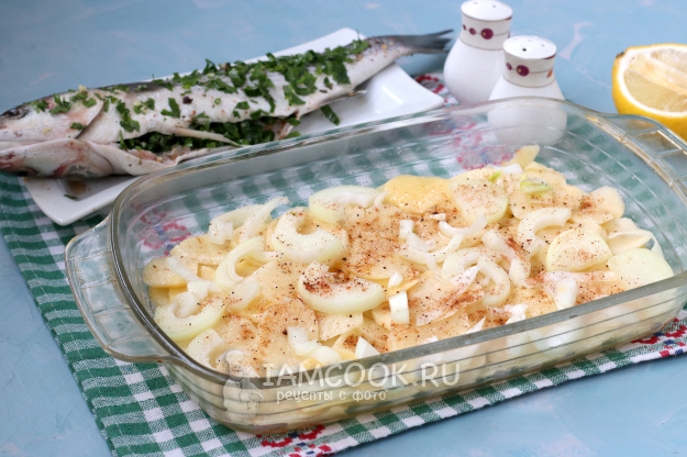 Форму смазать маслом. Картофель посолить и перемешать, выложить в форму. Сверху выложить нарезанный полу- или четверть-кольцами лук. Поперчить сверху и сбрызнуть растительным маслом.
