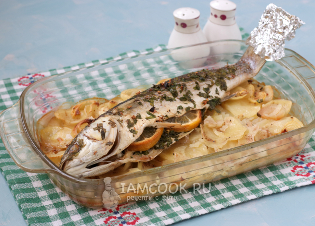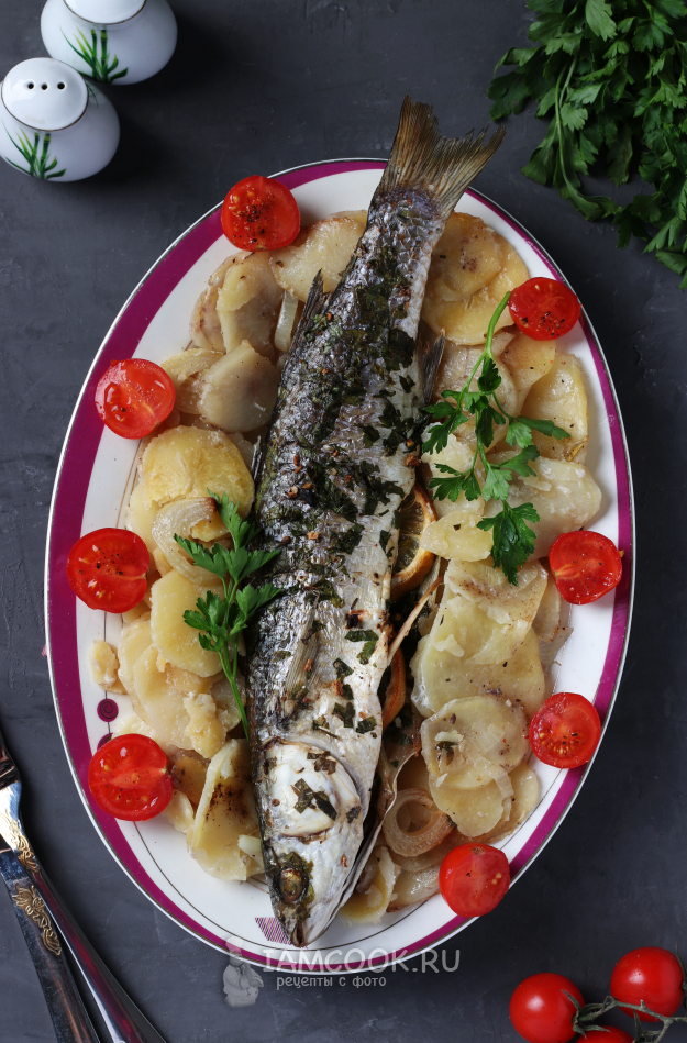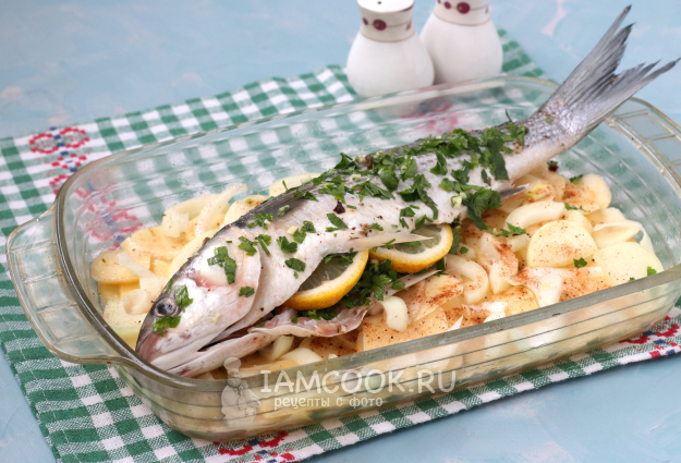 Готовую рыбу и картофель можно подать к столу прямо в форме, а можно сервировать на овальном блюде.