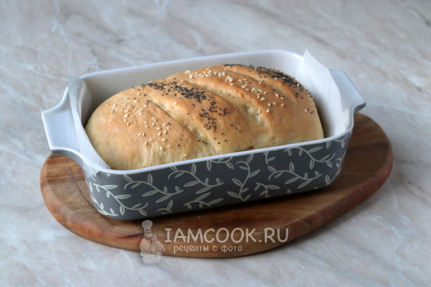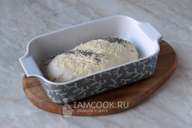 Подошедшее тесто обмять и выложить в жаропрочную форму, смазанную растительным маслом или застеленную пергаментом. На заготовке сделать косые надрезы (как на фото) и посыпать различными семенами, но это по желанию (у меня кунжут и мак).