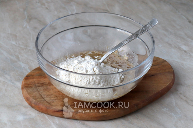 Затем ввести просеянную пшеничную муку. Учитывая, что мука у всех разная, её может понадобиться немного больше или меньше, поэтому добавляйте её небольшими порциями.