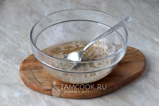 Пиво подогреть до тёплого состояния (не выше 40 градусов), добавить сахар и сухие дрожжи. Перемешать и оставить на 15 минут.
