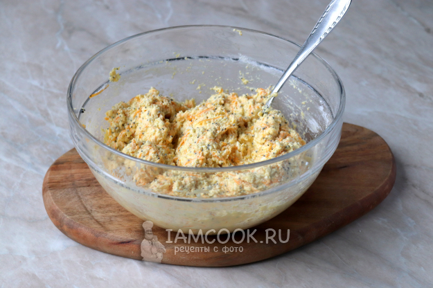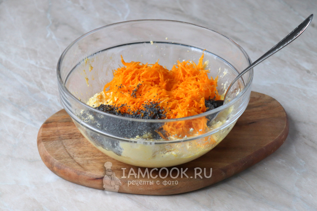 Тыкву очистим от кожуры и семян, а мякоть натрём на тёрке со средними ячейками. Получившуюся стружку и семена мака добавим в миску с творогом. Перемешаем.