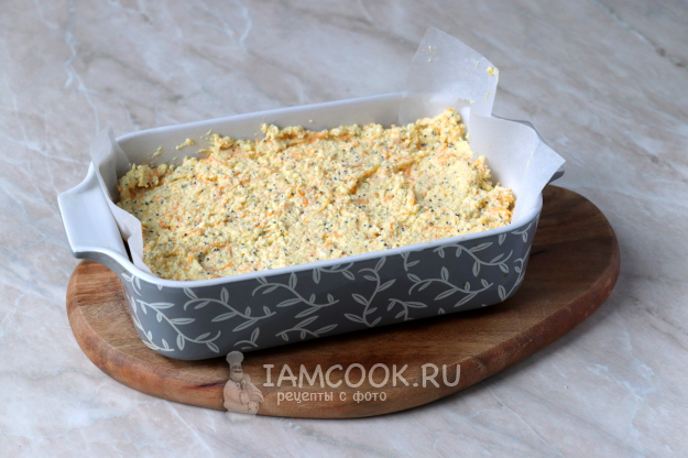Творожное тесто переложим в жаропрочную форму, застеленную пергаментом. Поверхность разровняем.