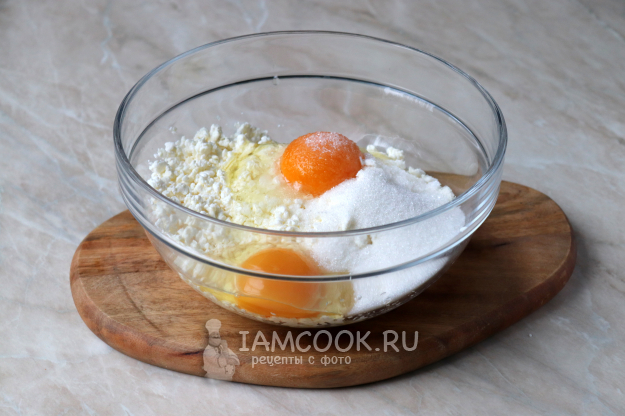 Творог переложим в глубокую миску, добавим куриные яйца и сахарный песок.