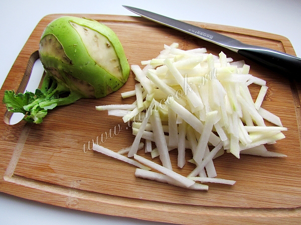 Кольраби тщательно вымойте, очистите и нашинкуйте тонкой соломкой. Можно натереть капусту на терке для корейской моркови.
