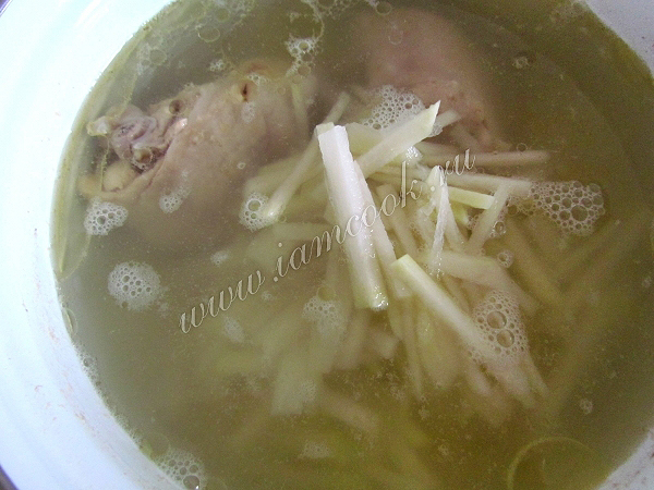 В кипящий куриный бульон опустите 1 целую луковицу, картофель и капусту.