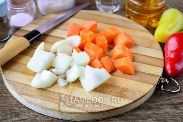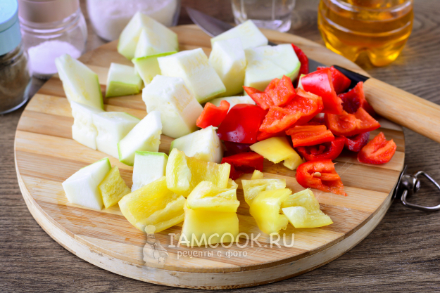 Почистите от семян сладкий перец, нарежьте крупными кусочками. Нарежьте так же и кабачки.