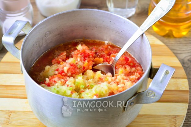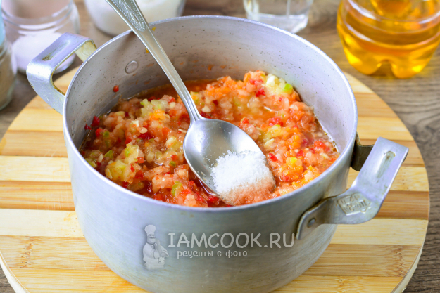 В кастрюлю с тушеной морковкой добавьте перекрученные кабачки и перец.