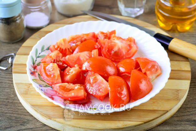 Тем временем нарежьте дольками вымытые помидоры, срезая плодоножки.