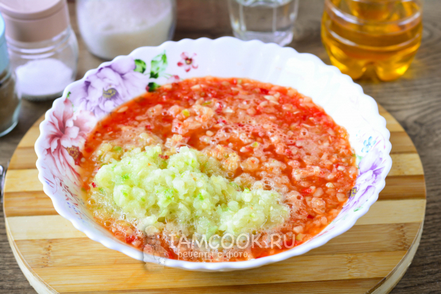 Перекрутите через мясорубку сладкий перец и кабачки.