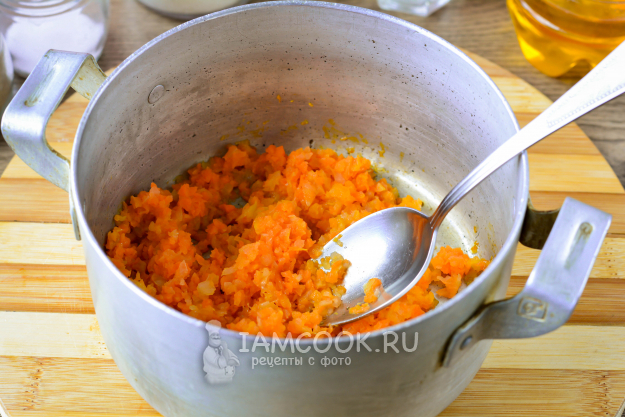 Налейте масло в кастрюлю, разогрейте на небольшом огне, всыпьте измельченную морковку с луком и пассеруйте пару минут.