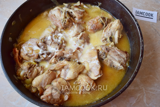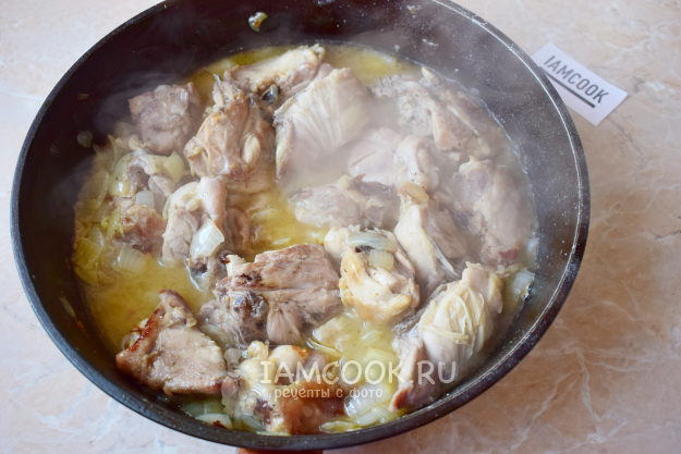 Затем влейте в сковороду 200 мл воды и накройте крышкой. Тушите курицу на небольшом огне в течение 15-20 минут. За это время курочка приготовится, а лук почти разварится и сделает соус гуще. На мой взгляд, в этом блюде чем больше использовать лука, тем вкуснее будет в итоге получаться.