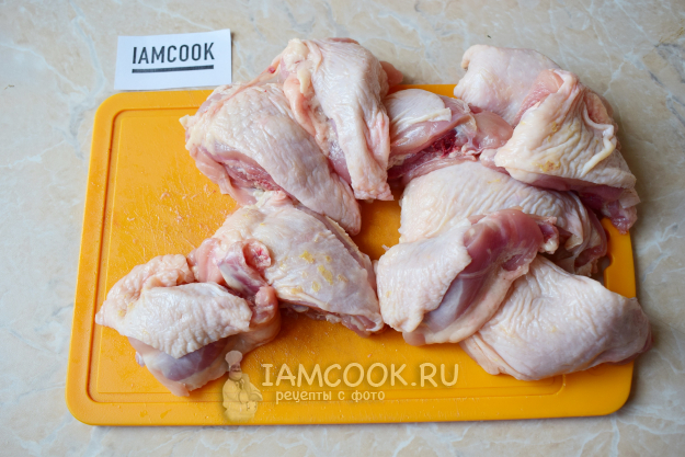 Куриные бедра можно готовить целиком, если они небольшие. У меня они достаточно крупные, поэтому каждое бедрышко я делю на 2 части.
