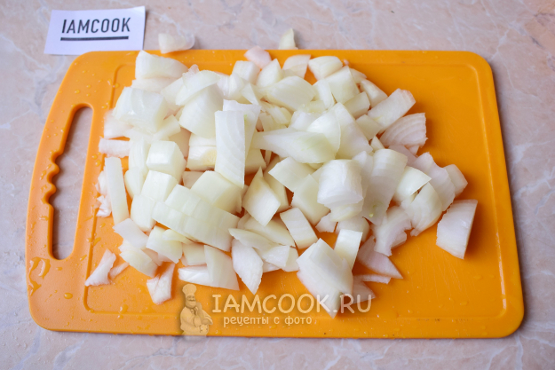 Пока курица жарится, подготовьте лук. Очистите его от шелухи и нарежьте. Можно нарезать крупно - полукольцами, а можно немного мельче.