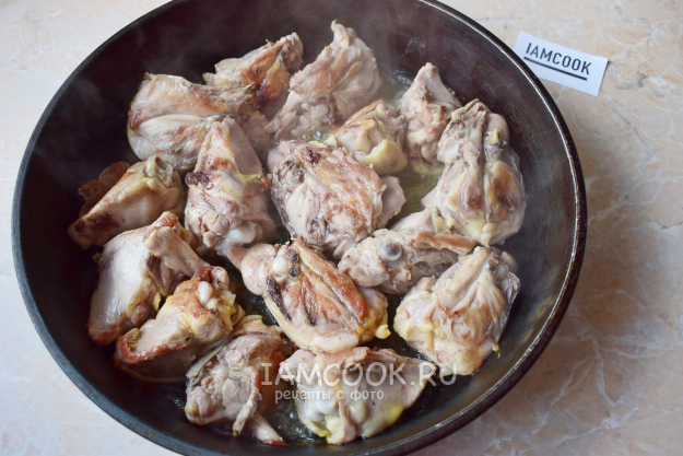 Возьмите удобную глубокую сковороду и нагрейте её до горячего состояния. Налейте в неё немного растительного масла и выложите курицу. Обжарьте её со всех сторон до золотистого цвета.