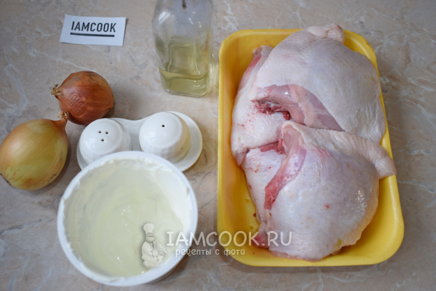 Для приготовления курицы в луково-сметанном соусе подготовьте необходимые ингредиенты. Готовить можно любые части курицы. Я буду использовать куриные бёдрышки. Сметану берите 15-20% жирности. От такой сметаны будет наиболее приятный сливочный вкус.