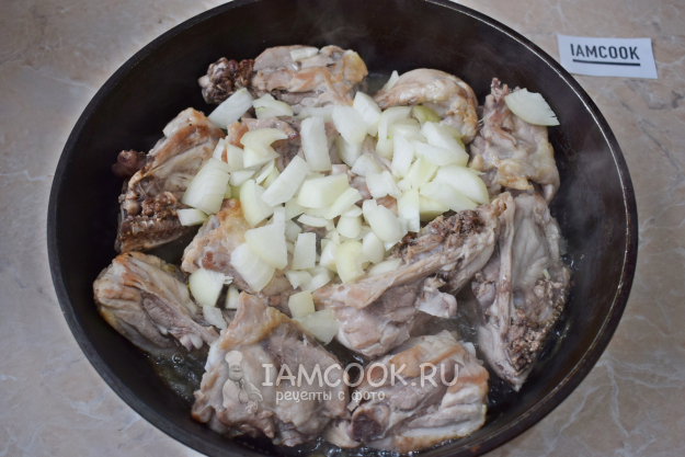Добавьте нарезанный лук в сковороду к курице. Все перемешайте и обжарьте еще 2-3 минуты, чтобы лук стал прозрачного цвета. При этом у него появится характерный аромат.