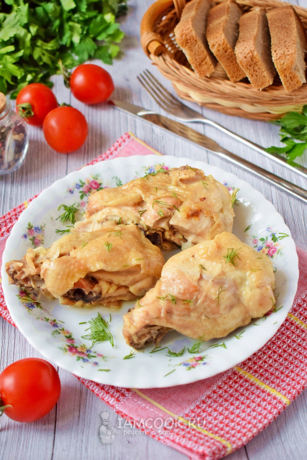 Курица в луково-сметанном соусе готова! Подавайте её в горячем виде. Можно дополнить любым гарниром.
