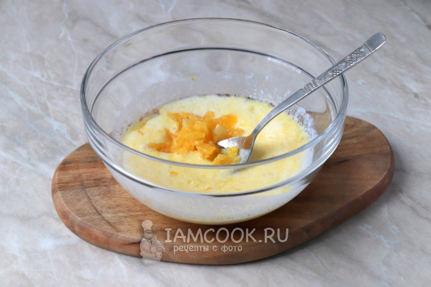 Апельсин тщательно помыть, обдать кипятком и снять с него цедру, нам её понадобится 0,5 ч.л. Следите, чтобы с цедрой вы не задели белую часть кожицы - она горчит. Затем аккуратно очистить апельсин, отделяя мякоть от кожицы и перегородок. Мякоть апельсина порезать на небольшие кубики и отправить в миску с кефирной смесью.