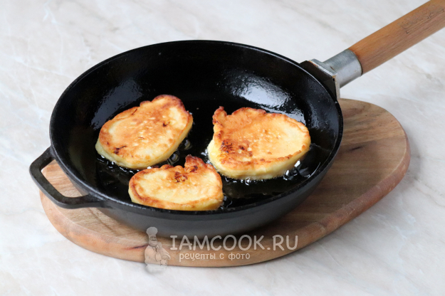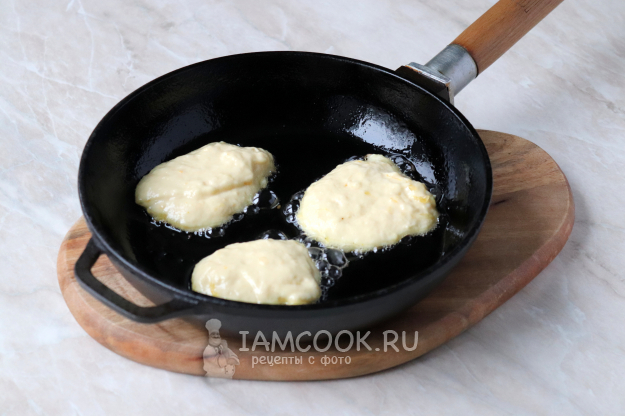 Сковороду с растительным маслом отправить на огонь и хорошо прогреть. Выложить небольшие порции теста, формируя круглые или овальные оладьи.