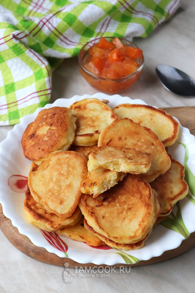 Вот и всё, вкуснейшие оладьи с апельсином, замешанные на кефире, готовы. Подавать их на стол лучше всего в тёплом виде с мёдом или сгущенным молоком.
