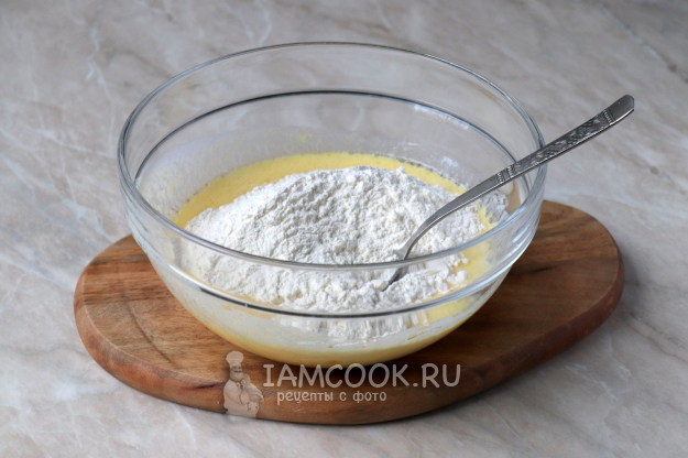 Ввести просеянную пшеничную муку и снова перемешать, чтобы не было мучных комочков. Учитывая, что мука у всех разная, её может понадобиться немного больше или меньше, чем указано в списке, поэтому добавляйте её небольшими порциями, контролируя консистенцию.