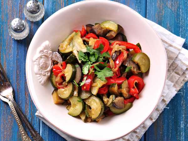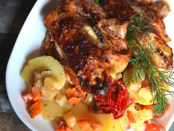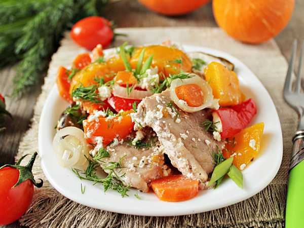 Отрежьте необходимую длину рукава, завяжите его с одной стороны, выложите овощи с индейкой, завяжите с противоположной стороны. Разогрейте духовку до 200 градусов, положите рукав в форму для запекания и отправьте на 30-35 минут запекаться при режиме без конвекции.