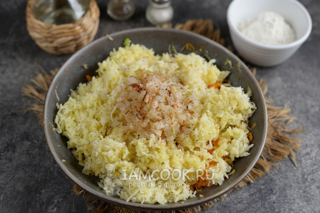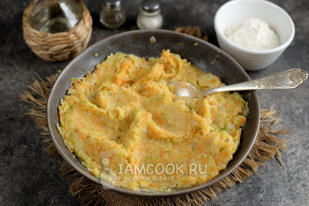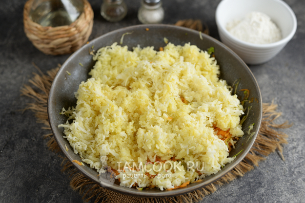 Картофель почистите от кожуры, остудите, натрите, переложите в миску к кабачку и тыкве.