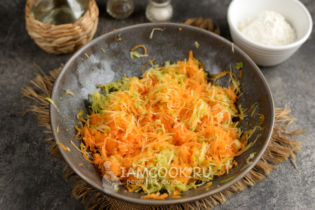 Тыкву так же натрите на той же терке, добавьте к кабачку.