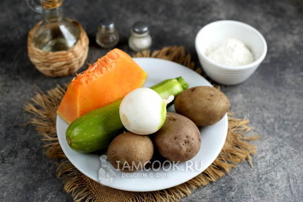 Возьмите продукты для постных котлет из тыквы и кабачков. Картофель помойте жесткой кухонной губкой, залейте водой и отварите в кожуре до готовности, минут 20-25. Также помойте и обсушите остальные овощи.