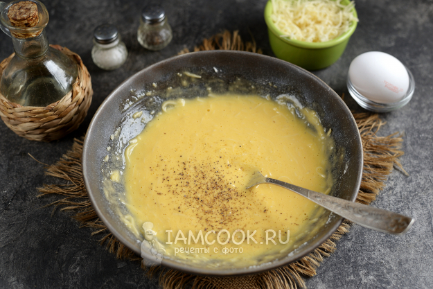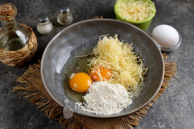 В глубокую миску вбейте два крупных яйца, всыпьте муку и твердый сыр.