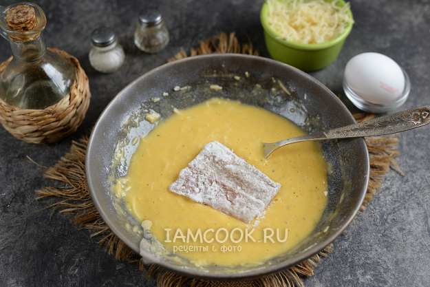 Каждый кусочек минтая запанируйте в муке, иначе кляр будет плохо держаться или не будет держаться на рыбе вообще, обваляйте с обеих сторон.