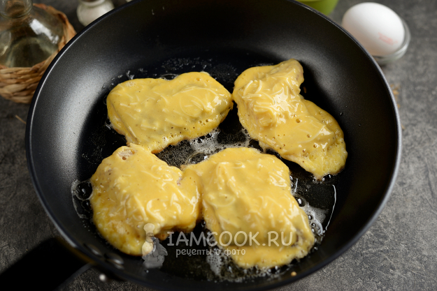 Перемешайте кляр до однородного состояния, посолите и поперчите его слегка. Если кляр вдруг получился слишком густым, его всегда можно развести водой или молоком, а если жидковат, тогда подсыпьте чуть больше муки.