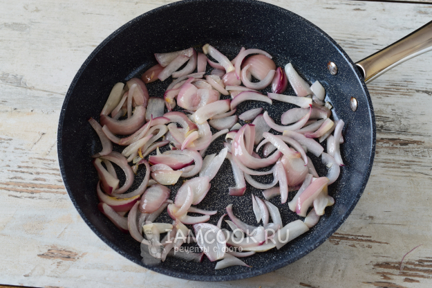 В сковороде разогреем растительное масло и обжарим лук до мягкости, помешивая, минуты 3-4.