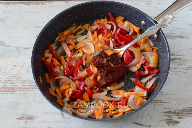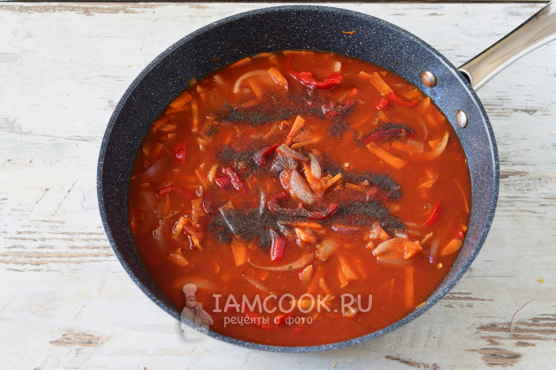 Вливаем 100-150 мл кипятка, вода должна полностью покрыть овощи. Хорошо перемешаем содержимое сковороды, чтобы томатная паста растворилась в воде. Добавляем соль и перец черный молотый по вкусу. Убавляем огонь до медленного и тушим овощи еще 10-12 минут, до мягкости моркови.