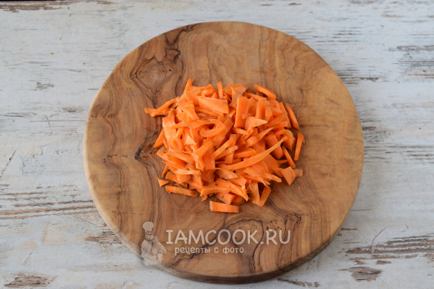Тем временем нарежем морковь небольшими тонкими брусочками, можно просто натереть ее на крупной терке.