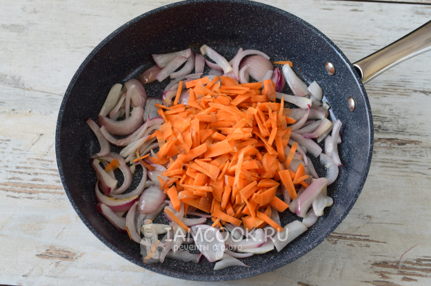 Добавим морковь в сковороду к луку и жарим овощи еще 3-4 минуты, помешивая.