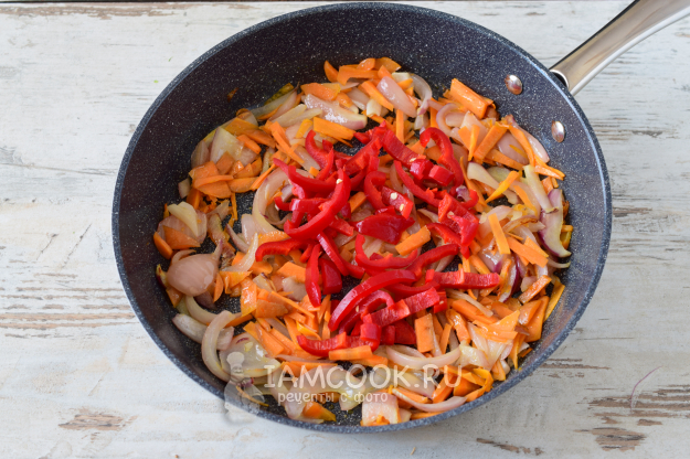 Добавим перец в сковороду. Обжарим овощи еще 2 минуты.