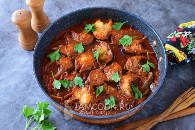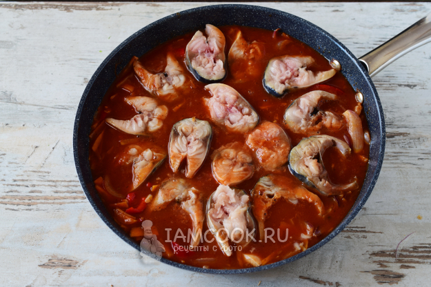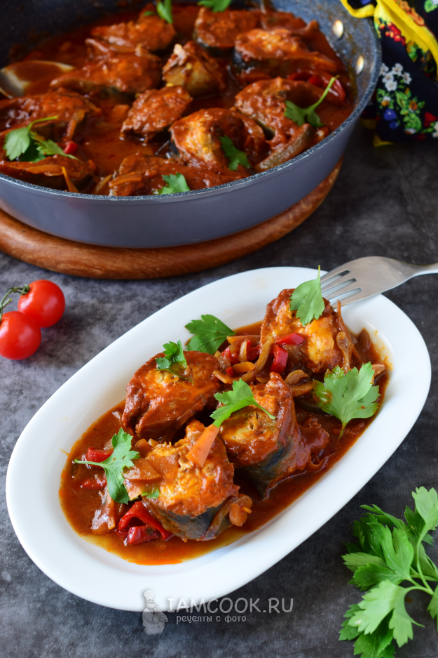 Раскладываем кусочки скумбрии равномерно по поверхности овощей и как бы "утапливаем" их в соус. Готовим скумбрию в томате с овощами на медленном огне еще 7-10 минут, накрыв сковороду крышкой.