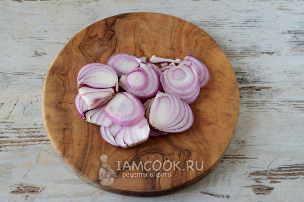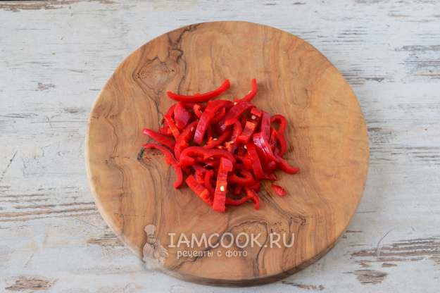 Болгарский перец очистим от семян и нарежем небольшими полосками.