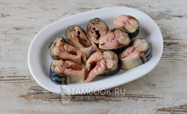 Если у вас скумбрия с головой, то голову стоит отрезать, почистить брюшко рыбы от внутренностей, хорошо удалить внутреннюю черную пленочку. Промыть рыбу после чистки под проточной водой. Нарезать каждую тушку на порционные кусочки.