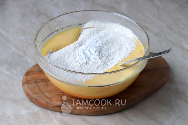 Затем ввести просеянную пшеничную муку с разрыхлителем.