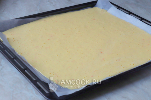 Вылить его на противень, застеленный пергаментом. Разровнять и отправить в духовку, разогретую до 180 градусов.
