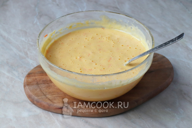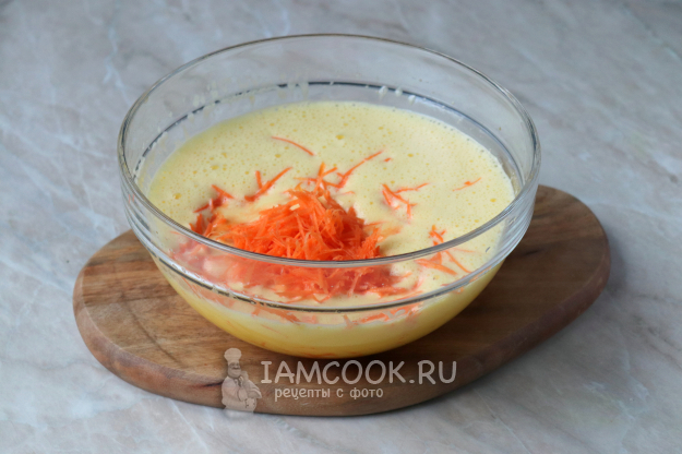 В яичную основу добавить натёртую на средней тёрке морковь и аккуратно перемешать, чтобы максимально сохранить воздушность массы.